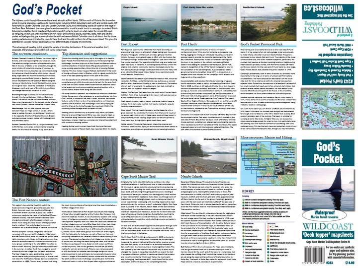 This mapsheet packages the waters from Fort Rupert, just east of Port Hardy to Shushartie Bay to the west. This includes God’s Pocket Marine Park, Goletas Channel, Deserters-Walker Groups, Nigei Island, Bate Passage, Vansittart Island and all archipelagos and locations leading from Port Hardy to the east entrance to Cape Scott Provincial Park. Use in conjunction with mapsheet #407 North Coast Trail for the current west extension. Eventually #244 Cape Scott will cover the marine travel portion of that route.