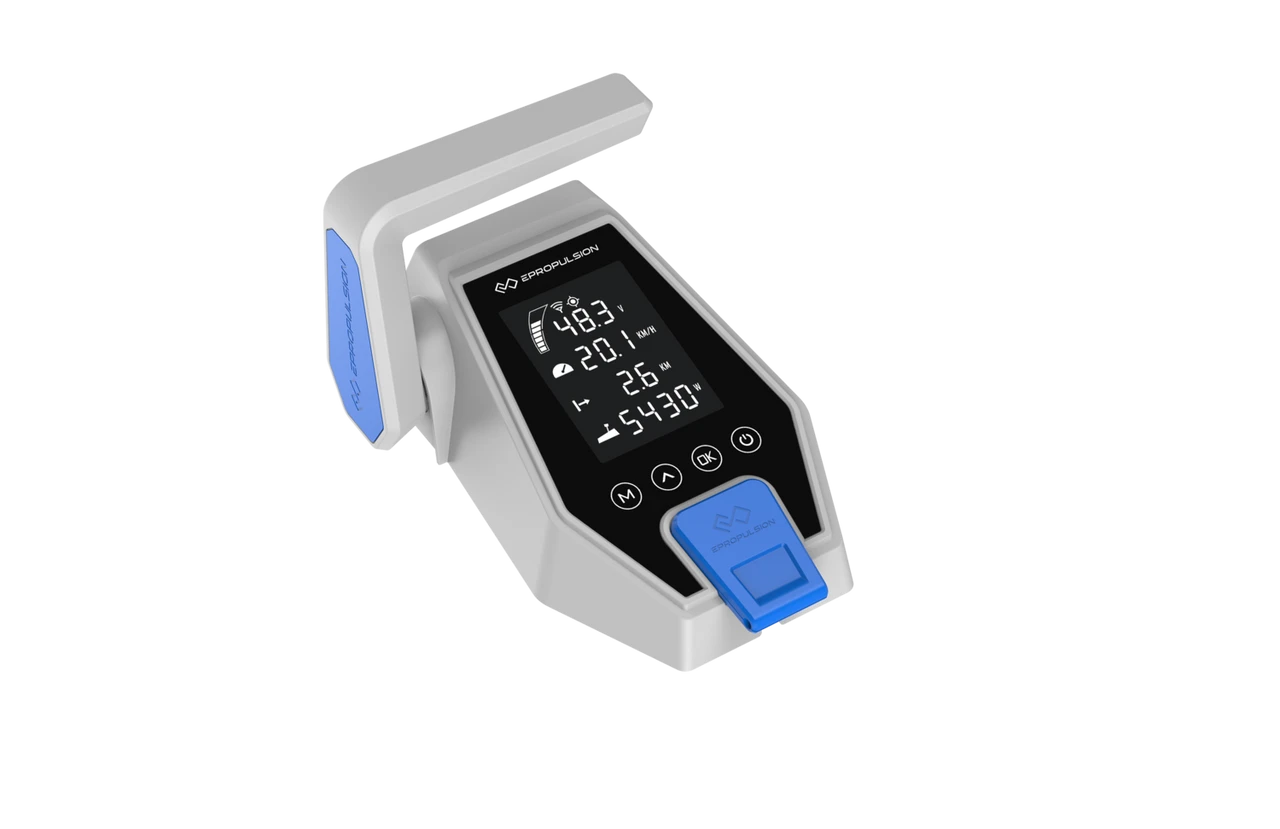 The ePropulsion Evo remote control is wireless and provides forward and backward speed control. Its LCD screen displays real-time sailing information. The kill switch guarantees safety when sailing. The solar panel constantly transforms solar power into electricity thereby reducing charging frequency.