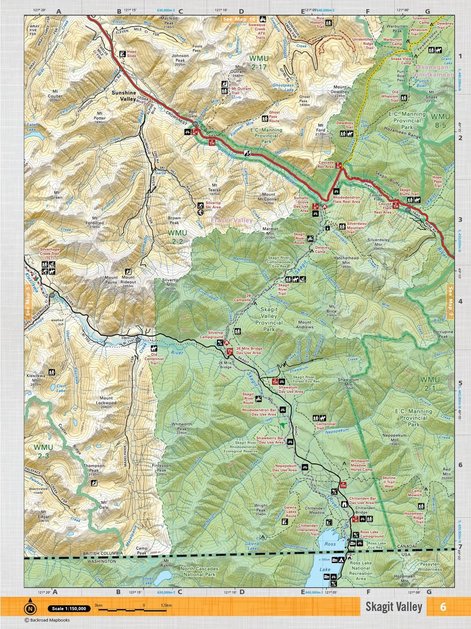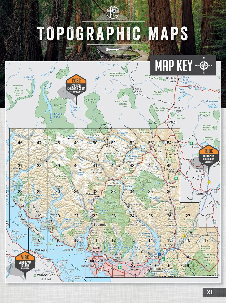 A detailed mapbook for outdoor adventures heading to areas near Chilliwack, the Fraser Valley, Gold Bridge, Greater Vancouver, Lillooet, Manning Park, Powell River, Squamish, the Sunshine Coast, and Whistler. Includes backroad networks and trail systems, along with information on parks, paddling routes, ocean kayaking, hiking routes, winter recreation, and wildlife viewing. Maps have elevation relief shading to help you identify land features.